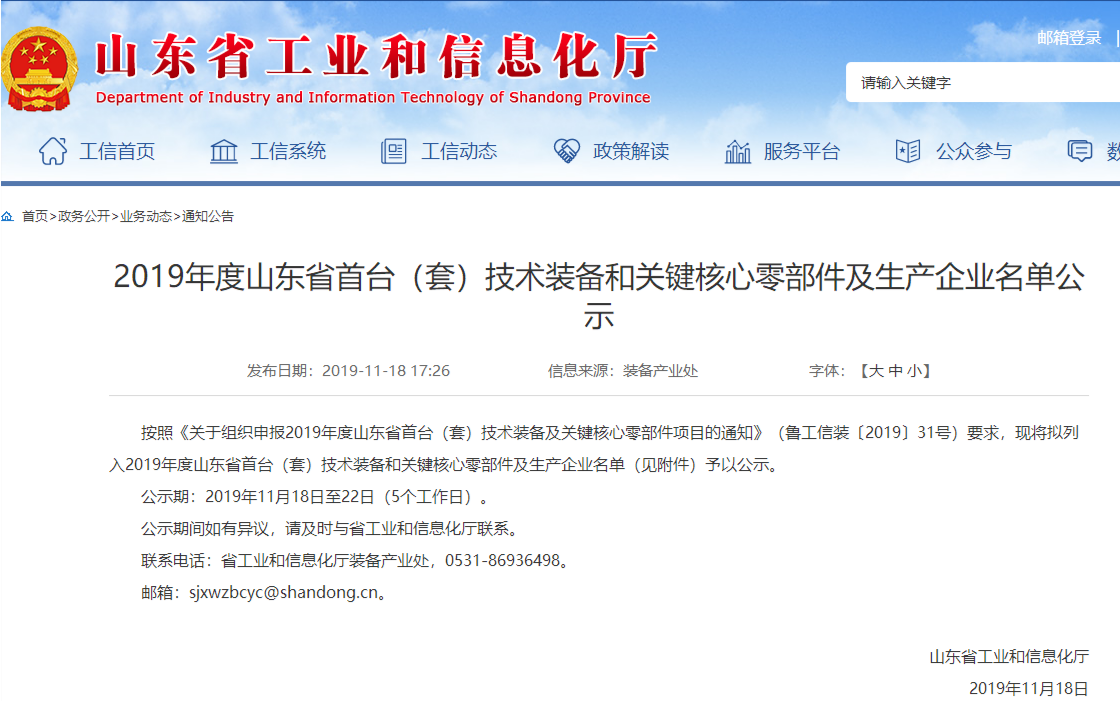 2019年度山東省首臺(套)技術裝備和關鍵核心零部件及生產企業名單公示